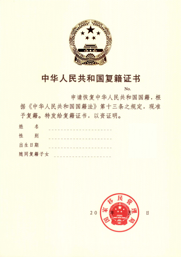 三、中华人民共和国复籍证书