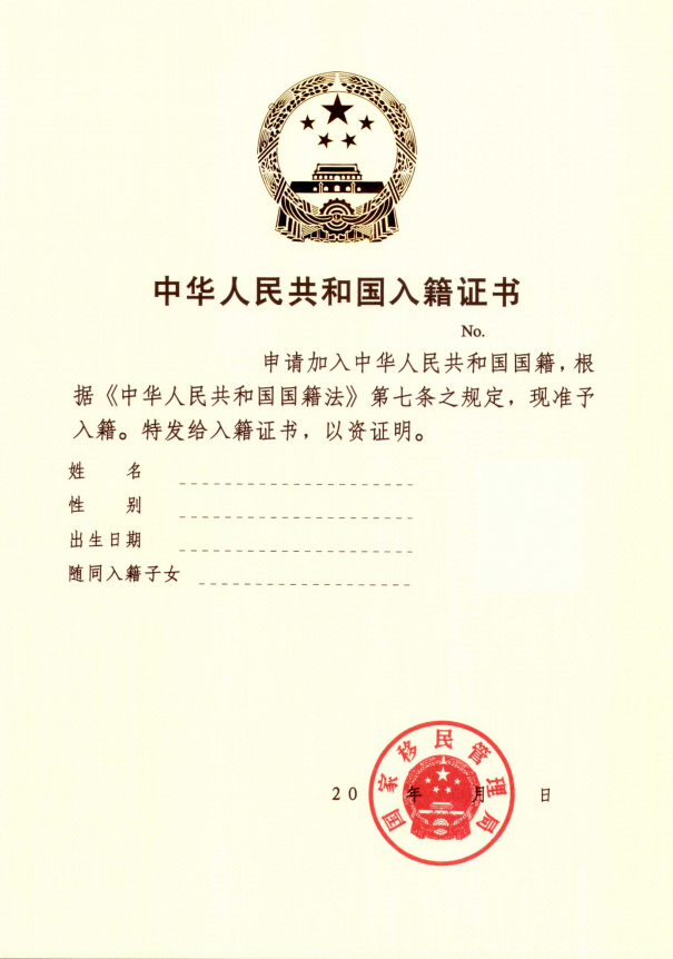 一、中华人民共和国入籍证书