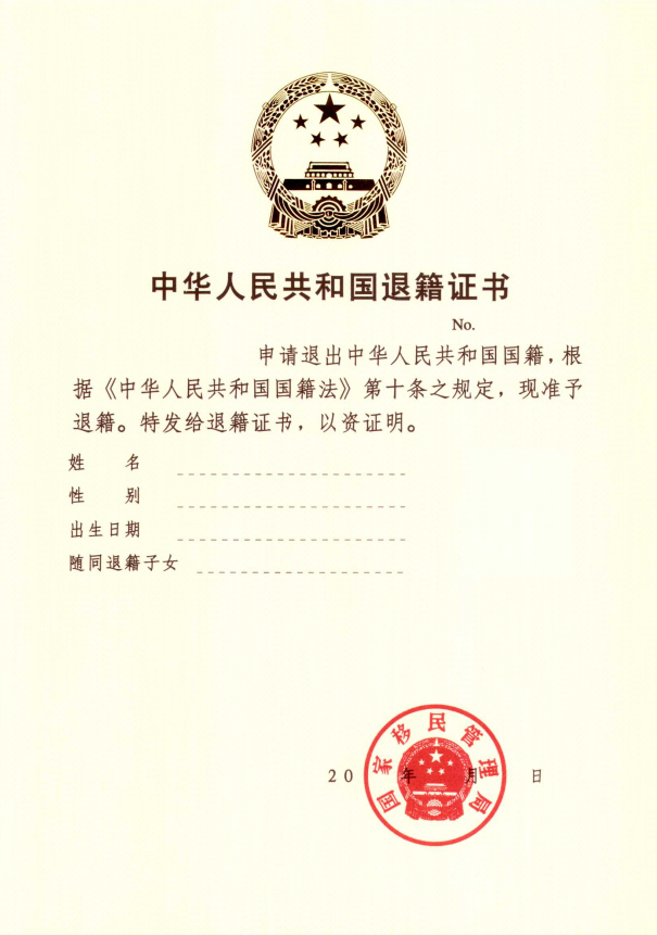 二、中华人民共和国退籍证书