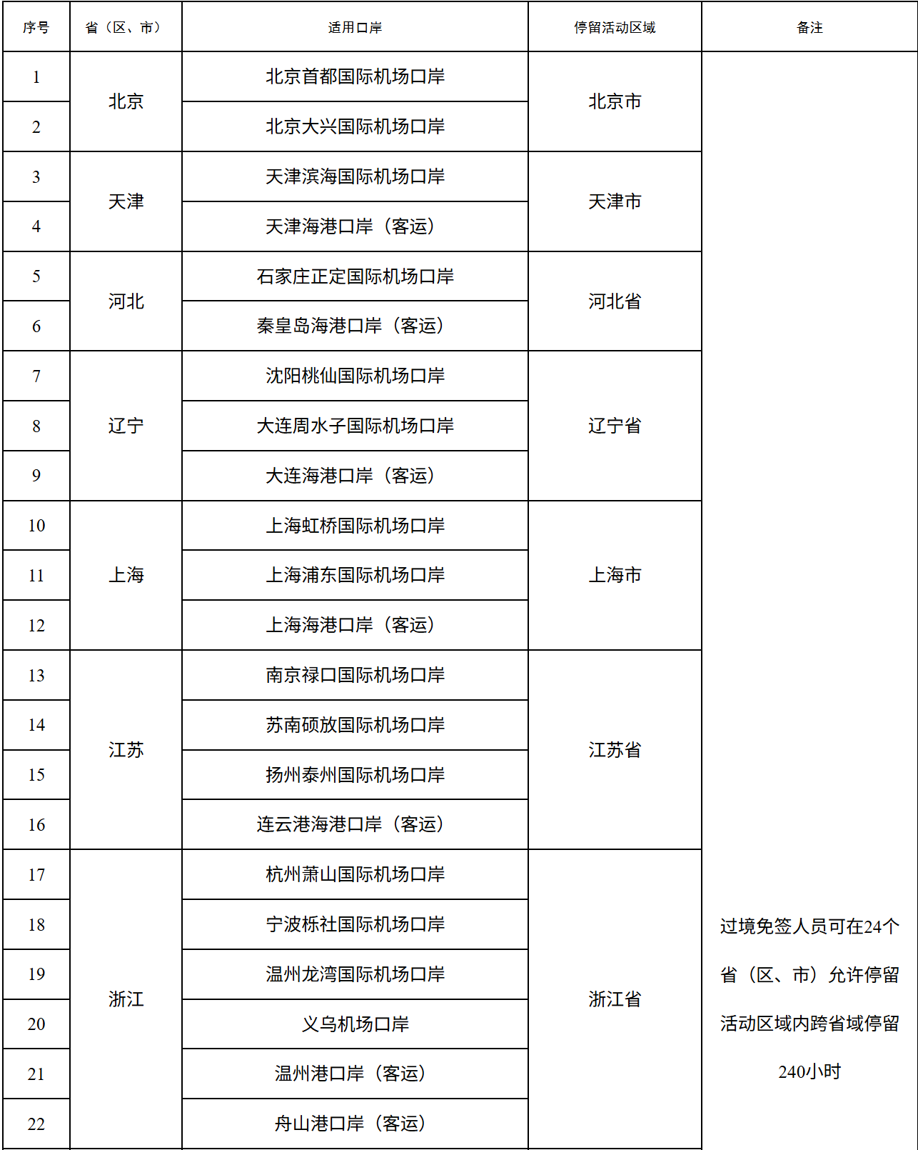 中国所有对外开放口岸对世界各国人员实施24小时过境免签政策。外国人持本人有效国际旅行证件和定妥座位的联程客票搭乘国际航行的航空器、船舶、列车从中国过境前往第三国或地区,在中国境内停留不超过24小时且不离开口岸限定区域的,可免办签证;如需离开口岸限定区域,应当向口岸出入境边防检查机关申请办理临时入境许可。