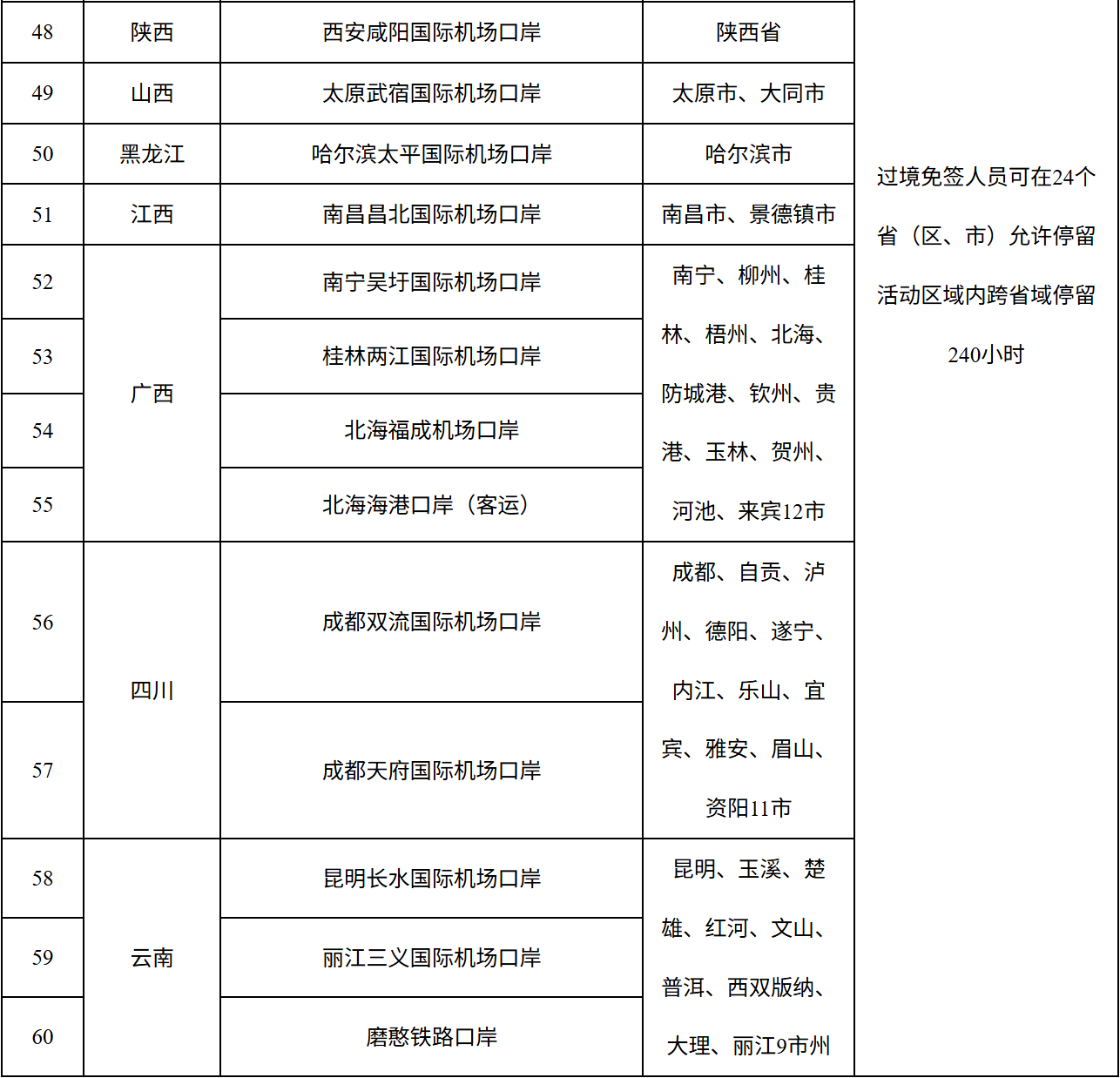 目前,中国已对美国、俄罗斯、英国等55国实施240小时过境免签政策,相关国家人员持本人有效国际旅行证件和确定日期及座位的联程客票,从中国过境前往第三国或地区,可从24个省份60个开放口岸中的任一口岸免签入境,并在规定区域停留活动不超过10天。停留期间可从事旅游、商务、访问、探亲等活动,工作、学习、新闻采访等需事先批准的活动仍应办妥签证。